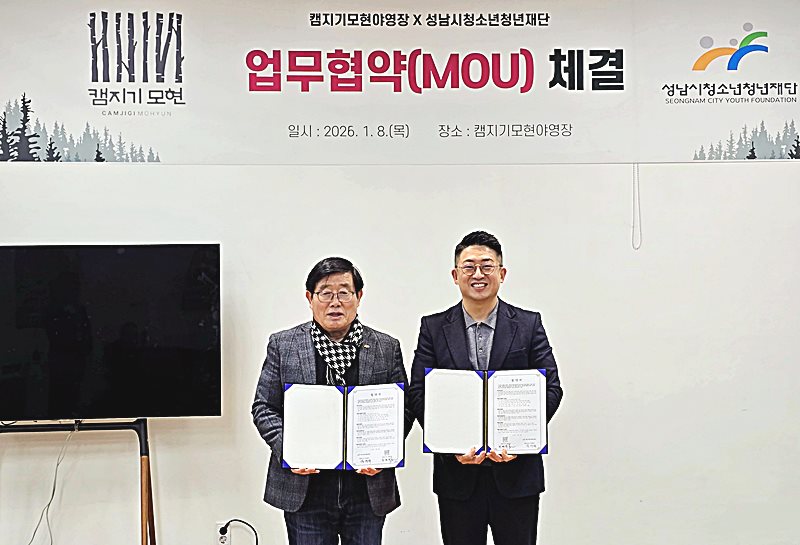 성남시청소년청년재단(대표이사 양경석)은 1월 8일 ㈜헬로그레이스 캠지기모현야영장과 청소년·청년의 환경보전 실천 및 친환경 여가문화 확산을 위한 업무협약을 체결했다고 밝혔다.이번 협약은 청소년·청년들이 숲을 보존하는 캠핑 문화를 지향하며, 자연에 흔적을 남기지 않는 아웃도어 윤리 교육(리…